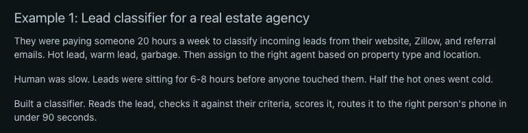A real estate agency's lead classifier paid for a full year of system costs in its first month. Three extra deals. 90 seconds per lead. No multi-agent orchestration. No RAG pipeline. Just one task, done reliably.