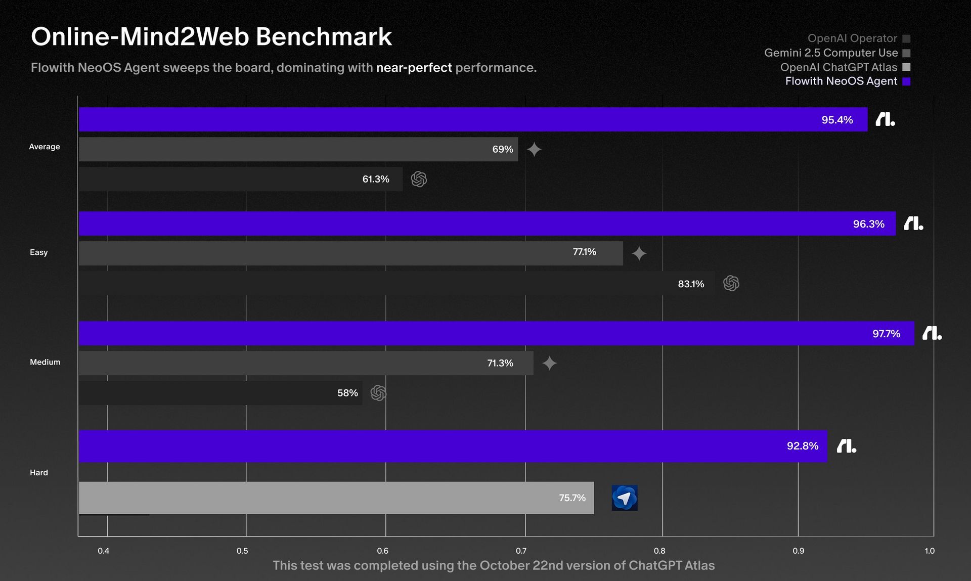 In early benchmarks, it reached a 97.7% execution rate and 95.4% average accuracy, outperforming every major AI browser. On the hardest benchmark level, it scored 92.8, where ChatGPT’s new Atlas topped out at 75.7.