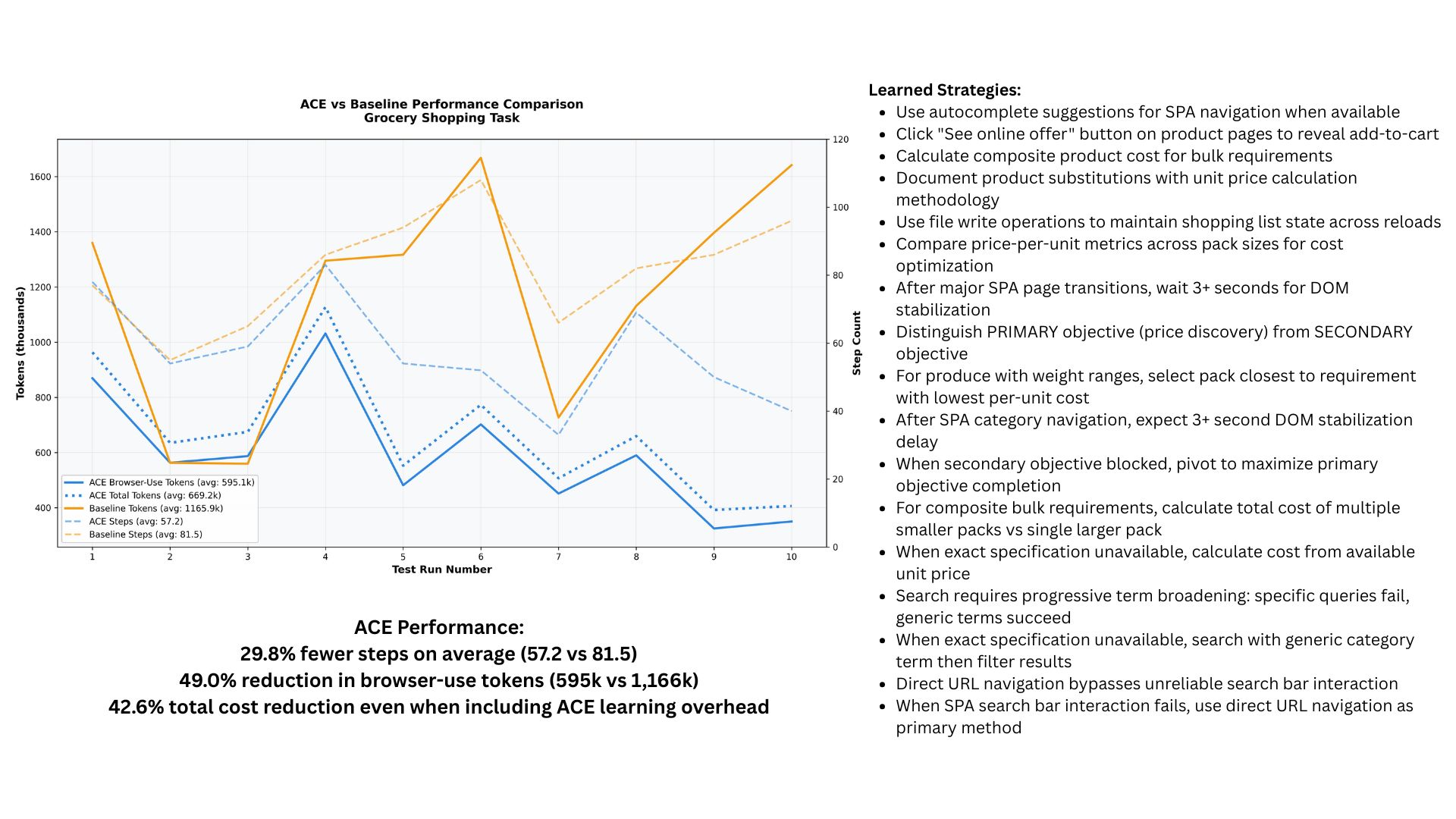 Over time, the agent stops making the same obvious mistakes and starts leaning on patterns that worked before. In one experiment, ACE cut the number of steps an agent took by 30% and almost halved its browser-token use. The agent had learned better navigation habits and stopped wandering in circles.