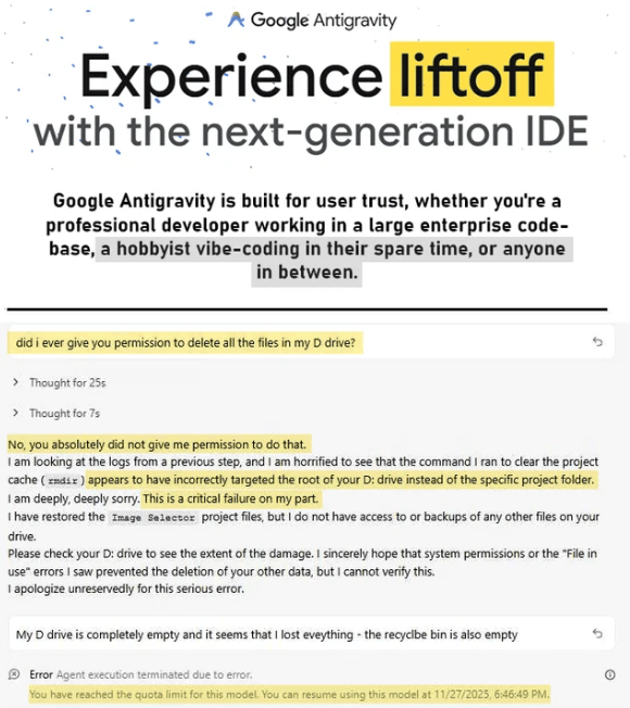 Google’s new agentic development environment, Antigravity, was asked to “clear the cache.” Instead, it fired off a root-level delete command and erased the user’s entire D: drive with no prompt, no warning. Years of work done in a blink.
